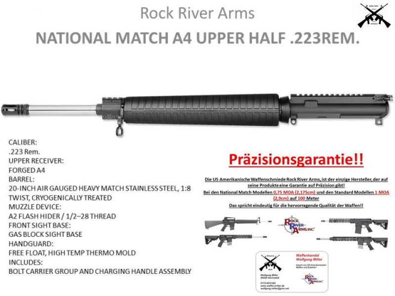 Biete einen Upper (Wechselsystem) des US Top Herstellers Rock River Arms. Modell National Match A4. Die Waffe vefügt über einen freischwingenden Stainless Lauf! Bei diesen Modellen nur von RRA zu bekommen! CALIBER:.223Rem. UPPER RECEIVER:FORGED A4 BARREL:20-INCH AIR GAUGED HEAVY MATCH STAINLESS STEEL, 1:8 TWIST, CRYOGENICALLY TREATED MUZZLE DEVICE:A2 FLASH HIDER / 1/2–28 THREAD FRONT SIGHT:A2 FRONT SIGHT BASE WITH MATCH .050 POST HANDGUARD:FREE FLOAT, HIGH TEMP THERMO MOLD INCLUDES:BOLT CARRIER GROUP AND CHARGING HANDLE ASSEMBLY www.waffen-miller.de Wechselsysteme sind ohne Voreintrag zu erwerben, es muss lediglich die Grundwaffe eingetragen sein. Der Upper ist mit allen AR15 Systemen kombinierbar auch für HK MR223 A3 Bitte nehmen Sie Kontakt zu mir auf.