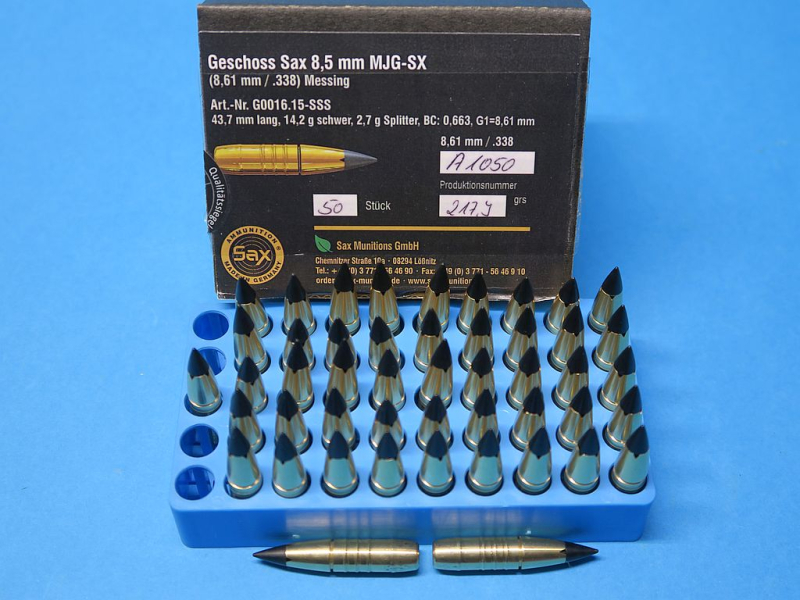 47 bleifreie Messingjagdgeschosse SAX: MJG-SX, Kaliber .338", 8,5mm, 14,2 Gramm, 2,7 g Splitter.