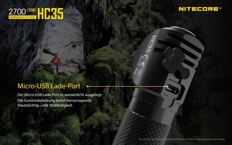 Dieser Akku liefert in der HC35 eine Leuchtleistung von bis zu 2700 Lumen über eine Dauer von ca. 45 Minuten hinweg. Geladen wird dieser 4000mAh Akku über einen Mikro-USB Anschluss, welcher in die Lampe integriert ist.
