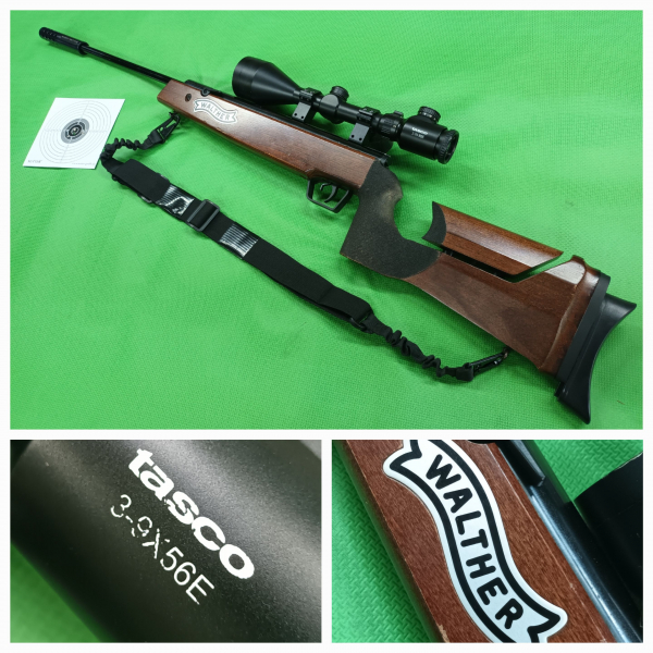 1. Echte WALTHER ,,JAGUAR,, Seitenspanner Luftgewehr für Jagdliches Schießen inklu. Zielfernrohr für 3-9x56E tasco. Das Luftgewehr ist MEGA SELTEN ! Schaftbacke und Schaftkappe sind Höhenverstellbar / Kal. 4,5mm Diabolo. Dazu einen Mündungsdämpfer Optik Schalldämpfer verbaut. Tragegurt mit Trageösen ebenso montiert. Walther Waffe : 44-1C-00139-96 (> F < im Fünfeck vorhanden) Die Walther schießt tadellos mit Konstanter V/o. 164m/s mit 7,5 Joul. Das ZF habe ich auf die Schnelle mit 5 Schuss auf 8m geschossen und das Schussbild soll euch nur zeigen, das dieses LG natürlich auch schießt. (Siehe Schussbild) Sorry, ich bin kein Prof. Schütze. Denke, das bekommt ihr noch besser hin. Kimme/Korn gibt es nicht. Der Sportschaft ist im Sehr guten Zustand ohne Brüche. Bitte Fair bleiben, das LG ist gebraucht und hat somit auch Gebrauchtspuren. Das LG stammt aus Privat Haushalt. Kein Rost / Keine Brüche ....Das LG schießt Zuverlässig ohne Klemmer oder Aussetzer. ABSOLUT TOP Sahnestück für eGun Käufer.