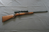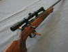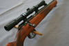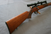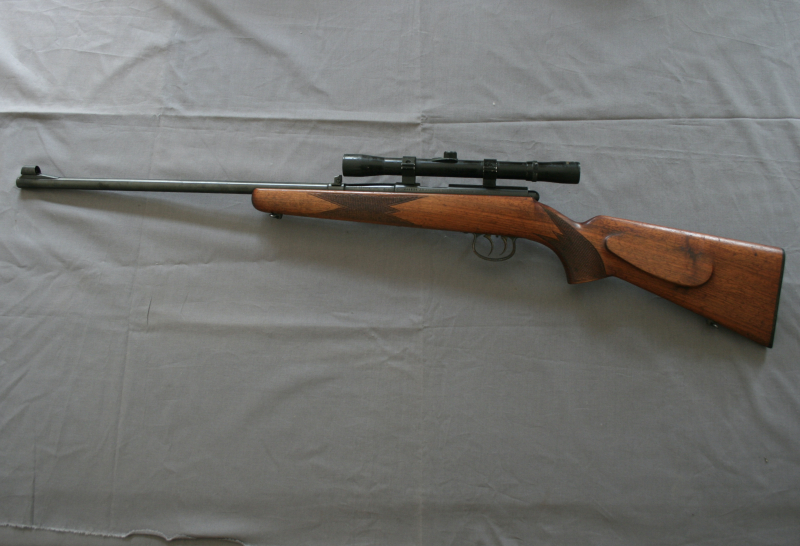 Anschütz, Ulm, Büchse, Kleinkaliber 22.lfr, Nußbaumschaft mit deutscher Backe, Pistolengriff, schöne gratige Fischhaut-Schäftung , Abzug mit Stecher, Einzellader, Zielfernrohr Standard 4x20, Absehen 1, Brünierung gut, leichter Flugrost an Laufmündung, Lauf Züge / Felder blank. Gewehr-Länge 101 cm.