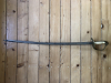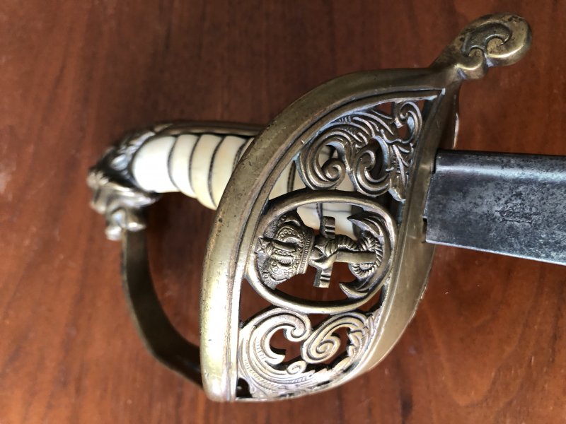 Aus Sammlungsauflösung wird ein historischer Marine-(Offiziers)säbel ohne Scheide angeboten. Es handelt sich vermutlich um ein Stück aus der Zeit um 1900. Hersteller ist die Firma E. & F. Hörster, Solingen (siehe Foto). Eine Scheide ist nicht vorhanden. Der Griff ist aus Bein (kleine Absplitterung unterhalb des Löwenkopfes) mit Drahtwicklung. Das Gefäß sitzt etwas wackelig auf der Klinge, aber die Feststellmutter ist durch eine Bohrung oben im Löwenkopf erreichbar und kann sicher nachgezogen werden. Die Klinge ist gerade, leicht fleckig und auf beiden Seiten mit maritimen Zierätzungen versehen. Bieter aus der EU bitte Versandkosten anfragen!