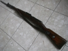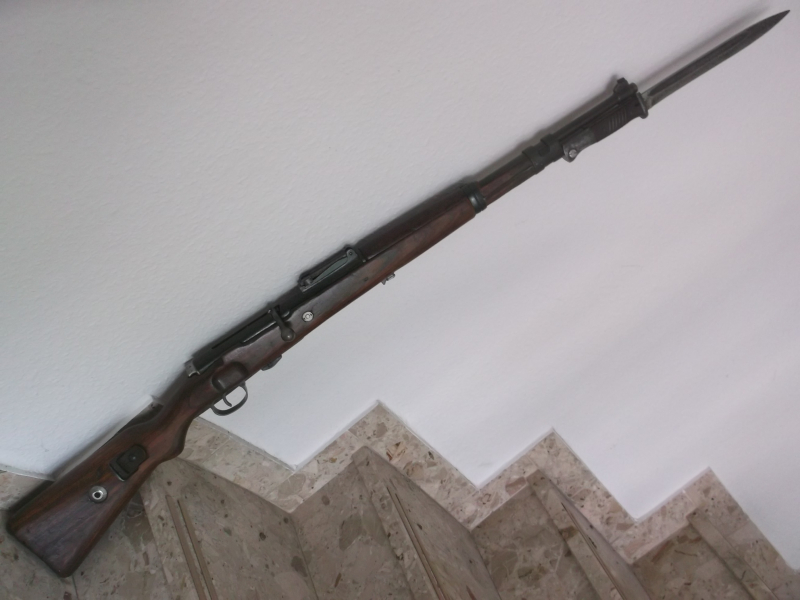 Schöner und sehr aufwendiger Umbau eines DDR Haenel Sportluftgewehrs Modell 49a im originalen Karabiner 98k-Schaft der deutschen Wehrmacht mit originaler Visierkimme und gebogenem Kammerstengel. Nicht nur die Optik ist soweit möglich detailgetreu, auch das abnehmbare dazu gehörige aufpflanzbare Original-Bajonett sitzt wie beim Originalgewehr K98 perfekt verriegelt. Das mehrschüssige Repetierluftgewehr