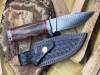 Typ: Handgefertigtes Jagdmesser mit über 200 Lagen Damaststahl. Durchgehende Full Tang-Klinge, Walnussholzgriff, Damast-Parierelement und -Knauf. Inklusive Lederscheide.