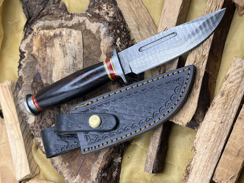 Typ: Handgefertigtes Jagdmesser mit über 200 Lagen Damaststahl. Durchgehende Full Tang-Klinge, Wangi-Holzgriff, Damast-Parierelement und -Knauf. Inklusive Lederscheide.