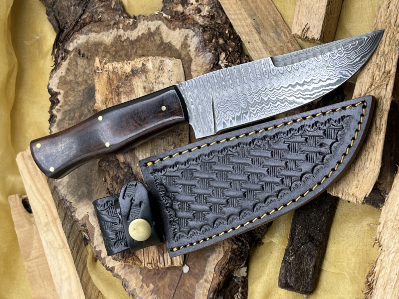 Typ: Handgefertigtes Jagdmesser mit über 200 Lagen Damaststahl. Durchgehende Full Tang-Damastklinge, Walnussholzgriff. Inklusive Lederscheide.
