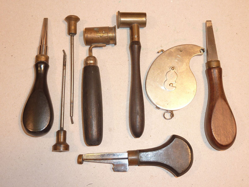3 wunderschöne alte Schraubendreher im Bestzustand,einer mit Räumnadel und 2 Pulverschöpfmaße und ein Zündhütchensetzer