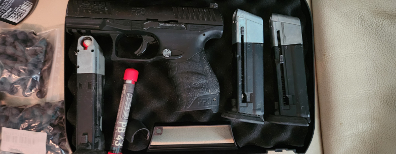 Hallo, hier verkaufe ich meine Walther ppq mit viel Zubehör und etwa 1000 Schuss Munition sowie CO2 Kapseln wegen Aufgabe des Hobbys. Es sind zusätzlich ein zweites Magazin und zwei Spezialfedern für die Gummigeschosse angeschafft worden denn die weichen pfefferkugeln haben dünnere Federn wie auf dem Bild zu sehen das sind die dünnen. Ein Spezial sus Magazin was man im Notfall sofort zünden kann habe ich auch erworben, alleine das hat schon 80 € gekostet. Bei diesem Magazin hat man die Kartusche CO2 vorgespannt und das Magazin voll geladen, in diesem Fall mit den dünnen Federn. So kann sich das CO2 nicht mit der Zeit des rumliegens der Waffe verflüchtigen. Sollte man die Waffe dann notfallmäßig brauchen schlägt man einfach unten vor den Kopf des Ventils und die Waffe ist sofort schussbereit Punkt alleine die spezialpfefferkugeln mit extrem scharfen Pfeffer haben über 20 € gekostet wenn ich mich recht entsinne es sind noch alle vorhanden also zehn Stück. Die Waffe hat eine kleine Macke an der Kimme, dort bin ich an eine Wand getitscht, wodurch das orangefarbene Pünktchen herausgefallen ist. Habe es durch ein weißes Pünktchen ersetzt Punkt ansonsten ist die Waffe in einem hervorragenden Zustand und hat richtig Druck. Auf 3 m hat sie durch eine Zimmertür geschossen und eine rundes Loch an der einschussstelle hinterlassen Punkt wer sowas auf die Haut kriegt hat keinen Spaß mehr. Bei Fragen stehe ich gerne zur Verfügung.