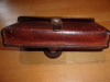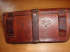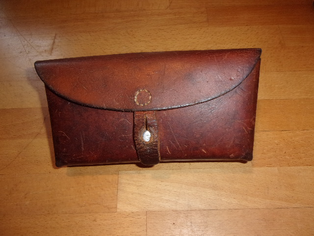 Patronentasche, Schweizer Modell, schweres Sattelleder, Nähte in Ordnung, Gebrauchsspuren, keine Beschädigungen, Schlaufendurchlaß für Gürtel: 4cm, Innenlänge: 19cm, Innenhöhe: 9cm, Innenbreite: 2,5cm