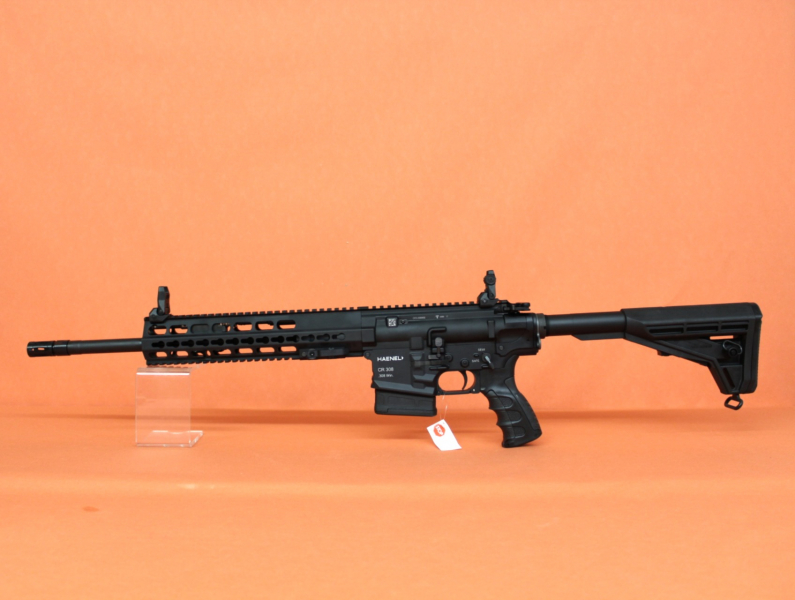 Ha.Büchse .308Win HAENEL CR308: 2-Positionen Gas-Piston-System SR-25 (schwarz), 16,65" Lauf mit Mündungsfeuerdämpfer (M15x1 - ca. 60 Nm!), Verschluß mit Schlagbolzensicherung, Upper Receiver mit Picatinnyprofil, beidseitig bedienbarerer Spannschieber mit vegrößerter Entriegelung (Big Latch), Lower Receiver mit beidseitigen Bedienelementen: Sicherungs-(auch entspannt sicherbar)/ Magazinlösehebel/ Verschlussfang, Direktabzug (ca. 32N), beidseitiger Karabineröse (Receiver End Plate Loop), 293mm QD Alu KeyMod 2-Rail-System/ -Handschutz, 6-Pos. Schubschaft mit einstellbarer Wangenauflage, 10-Schuß Magazin. Incl. Flip-Up-Visierung. Kunststoffkoffer als Transportverpackung.