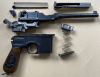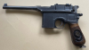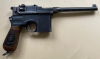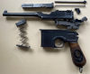 Sie bieten auf eine Mauser C96 9mm Para mit der Seriennummer 58280 und neue Sicherung im Kasten, mit Belederung, Putzstock und Ersatzfeder.