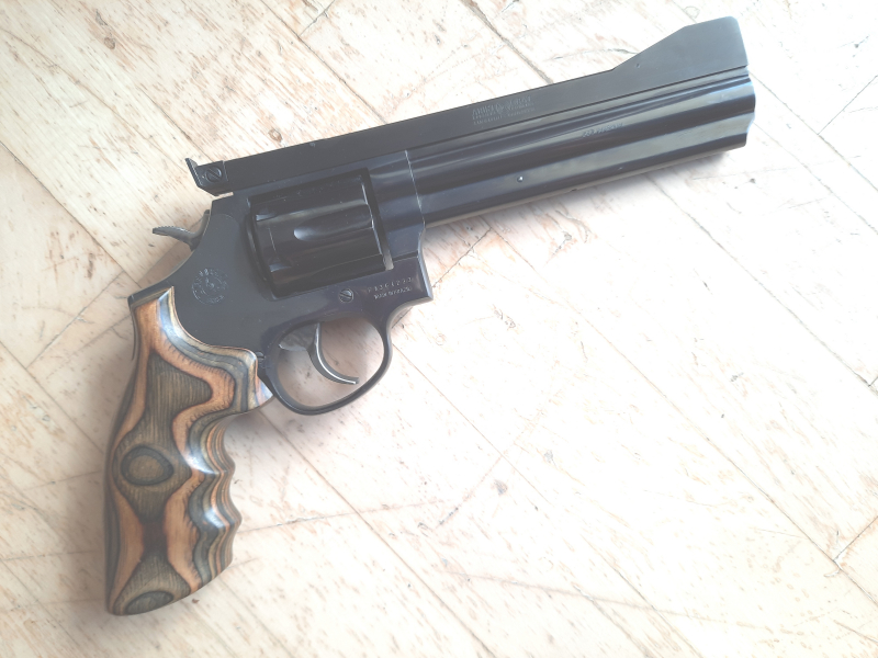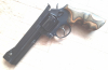 TAURUS-Revolver ohne Modellbezeichnung, sehr guter Zustand, Luftspalt kleiner 1/10 mm, perfektes Timing, keine "Magnumrille", weicher Schlossgang, Abzugswidersand gemessen ca. 1500 g, augenscheinlich geringe Schussbelastung. Sehr schöne Holzgriffschalen. Lauf sehr gut mit scharfem Zug/Feld-Profil.