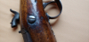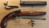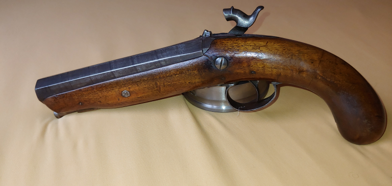 Historische Vorderlader-Perkussionspistole, Hersteller unbekannt. Glatter Lauf mit kleinen Rostnärbchen, Kaliber 16 mm. Kleiner Riss im Schaft gegenüber dem Hahn. Gesamtlänge ca. 30 cm, auf der Unterseite des Laufs verschiedene Stempel bzw. Beschusszeichen, die ich nicht zuordnen kann. Der Hahn lässt sich sicher in 2 Rasten feststellen.