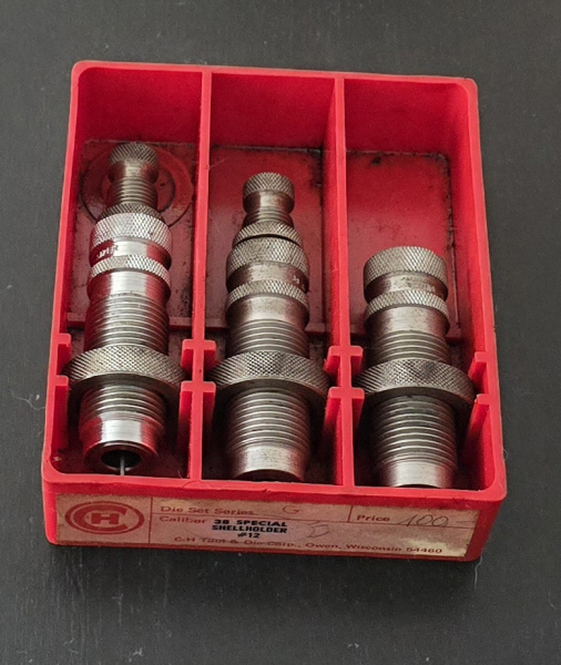 Hallo, ich biete hier einen Matritzensatz der US Fa. C-H Tool & Die im Kaliber .38 Spezial an. Er ist in gutem Zustand, hat lediglich äuserlich Anhaftungen von ranzigem Fett. Von Innen sehen die Matrizen für mich unbenutzt aus. Ich habe mir sagen lassen, in den Staaten sind die Teile ein Geheimtipp und hier bei uns absolut nicht zu kriegen. Sie stammen aus einem Nachlass und haben da wohl nur im Schrank gelegen.