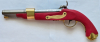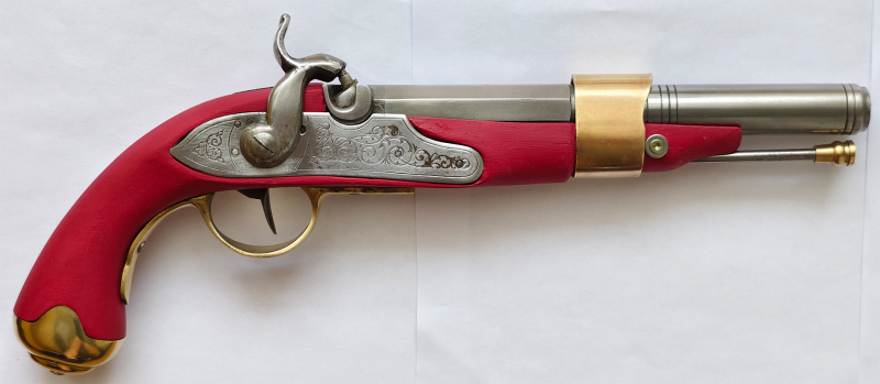 Verkaufe eine wunderschöne Vorderlader Perkussionspistole, Kaliber 44, in hell rotem Design, sieht sehr edel aus, mit leichten Gebrauchsspuren. Die Pistole hat schöne hell glänzende Messinggarnituren, die kleine Messing-Platte auf der Rückseite ist matt geschliffen. Die Schloßplatte und der Lauf auf der Oberseite haben schöne florale Verzierungen (s. Fotos). Sie hat einen glänzenden eckigen Lauf, der in rund übergeht.