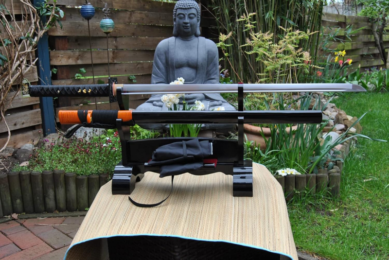 Handgeschmiedete NINJA Schwert . von Hand geschmiedeter 1045 Kohlenstoffstahl Gesamtlänge: 104 cm Klingenlänge 73,5cm,Grifflänge 27cm. Gewicht mit Saya : 1200 gr, Gewicht ohne Saya:950 gr, lackierte Holz Saya Griffumwicklung aus Baumwolle ist traditionell angebracht das Schwert ist scharf geschliffen Ohne Ständer.