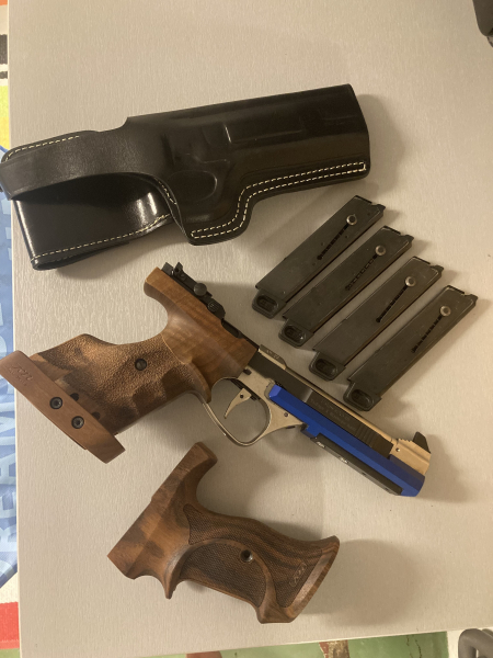 Verkaufe meine Feinwerkbau AW93, gekauft 2021 vom Schwiegervater. Die Pistole wurde nur wenig geschossen (ca. 3000 Schuss) und ist in sehr gutem Zustand. Griffgröße ist XL. Mit dabei sind ein Sportec-Holster, vier 6-Schuss-Magazine, ein zusätzlicher Griff (siehe Foto) sowie eine neue Rückstoßfeder. Wer die Pistole persönlich abholt, bekommt zusätzlich 1000 Schuss .22er Munition gratis dazu.