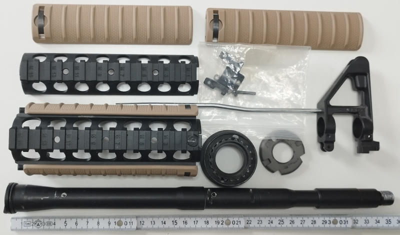 Railhandguard mit Railcovern (tan), Außenlauf, Gasrohr mit Korn und Befestigungsteile für eine M4 GBB von WE.