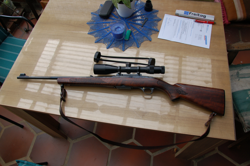 Elegante und handliche Selbstladebüchse Winchester 100 im Kal. .308 Winchester. Gesamtlänge 106 cm, Lauf 54 cm, Abzug bis Schaftende 33 cm.Schöner Nußbaumschaft. Das ZF Docter VZF -M- 2,5 - 10 x 48, Abs. 1 gehört nicht zum Angebot. Leupoldmontage mit 26 mm Ringen. Schnell und ohne Werkzeug abnehmbar. Der Lauf ist blank.. Das Magazin faßt 4 Patronen. Das Einführen des Magazins ist manchmal etas fummelig. Brünierung und Zustnd sehr gut. EWB muß nachgewiesen werden. Tel. der Behörde mit Namen des Sachbearbeiters erforderlich.
