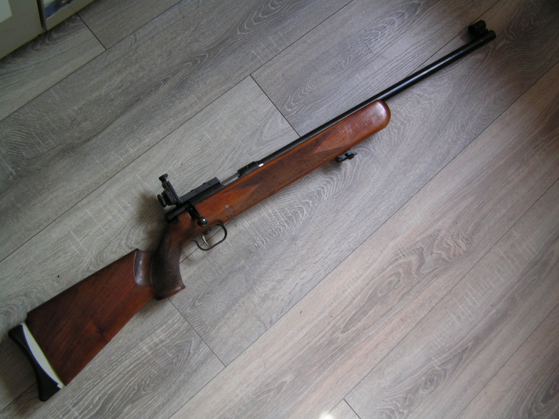 Ein Nostalgie-Schätzchen sucht einen neuen Benutzer. Baujahr 1965, alt aber immer noch sehr gut zum Auflageschießen. Der letzte Benutzer traf gute Trefferbilder von ca. 20mm Durchmesser aus der Schulter.Die Schaftkappe ist von Feinwerkbau, der Diopter von Walther, das Seitenverstellrad ist praktischerweise auf der linken Seite. Die Brünierung ist fast vollständig, am Schaft findet man die altersgemäßen Gebrauchsspuren.