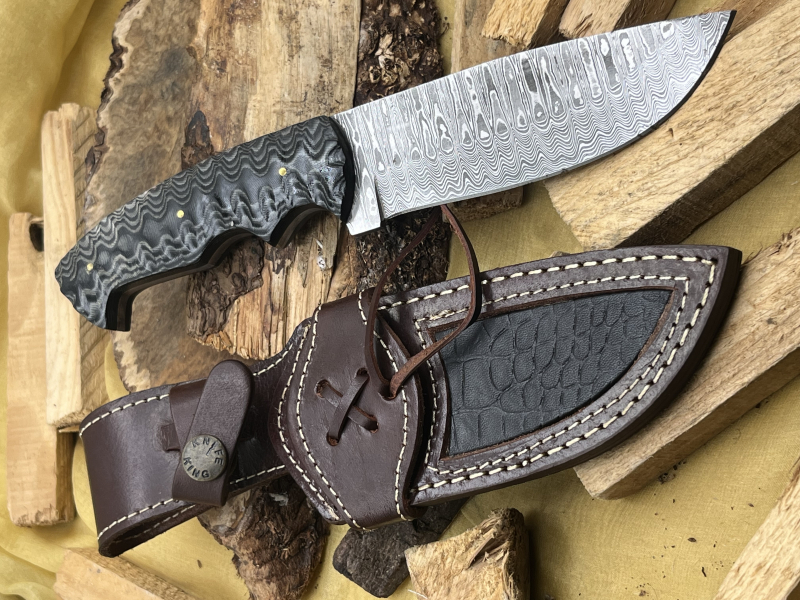 Typ: Handgefertigtes Jagdmesser aus über 200 Lagen Damaststahl. Durchgehende Damaststahlklinge (Full Tang). G10- oder ähnlicher Griff. Inklusive hochwertiger Lederscheide.