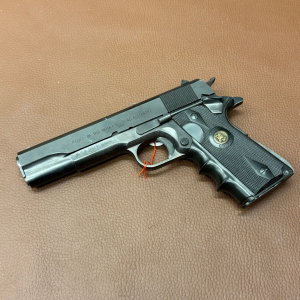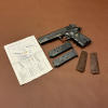 Zum Verkauf steht eine gebrauchte, robuste Norinco 1911A1 im Kaliber .45 Auto, ausgestattet mit Pachmayr „Gripper“ Griffschalen mit ausgeprägten Fingerrillen für optimalen Halt. Die Pistole verfügt über eine starre Visierung.