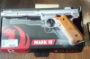 Es handelt sich um eine klassische Knicklauf-Druckluftwaffe im Kleinkaliberpistolen-Design. Sie hat ein Stainless Steel Finish. Die Knicklaufpistole ist mit einem Metall-System ausgestattet und verfügt über detailgetreue Original-Markings. Der Rest des Modells besteht aus hochwertigem Kunststoff. Weitere Merkmale sind ein gezogener Lauf, eine höhen- und seitenverstellbare Kimme, eine manuelle Sicherung sowie ein Fiberoptik-Korn. verschießt Diabolos im Kaliber 4,5 mm.(einige verschiedene Diabolos lege ich dazu)