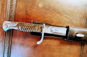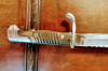 Biete das deutsche 98/05-Bajonett mit Sägerücken, für Pioniertruppen. Es ist komplett mit Scheide und Koppelschuh. Von den Gegnern im ersten Weltkrieg respektvoll "butcher-knife-bayonet" genannt, ist es ein Klassiker soldatischer Bewaffnung. Es ist in sehr gutem Zustand, so gut wie kein Rost, Drücker gängig, der Sägerücken ist rasiermesserscharf (Vorsicht!). Vermutlich ist das gute Stück mal - durchaus professionell - überarbeitet worden, dabei ist die Herstellermarke aber zum Teil ausgeschliffen. Das Manko an dem sonst tadellosen Seitengewehr.
