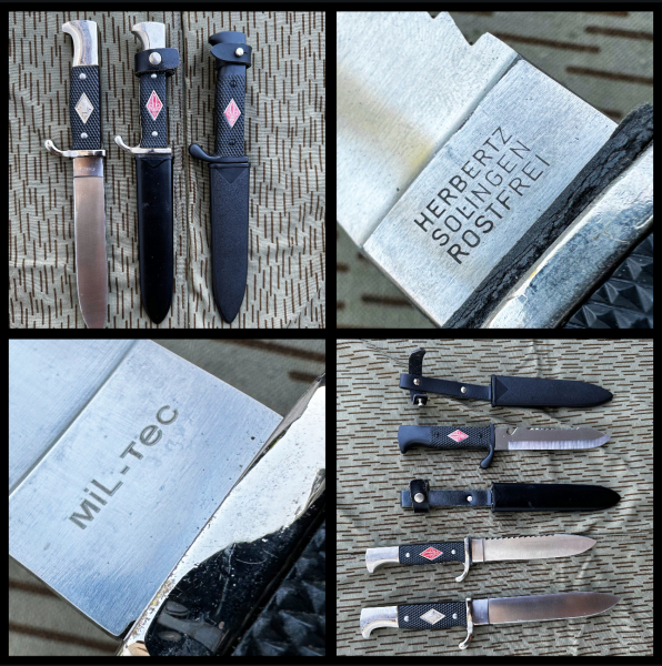 3 verschiedene Fahrtenmesser der Pfadfinder, das Herbertz ist wohl das älteste und auch Original. Das Schwarze ist aus Plastik, Scheide wie Griff.