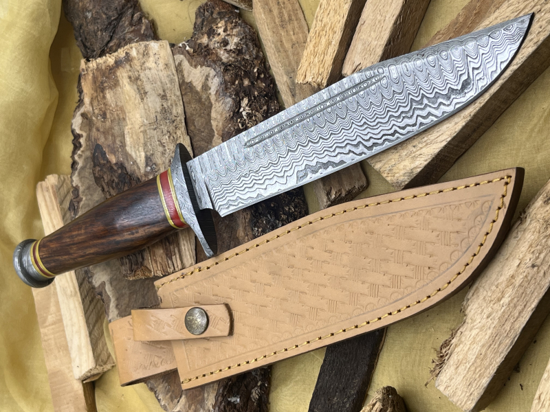 Typ: Handgefertigtes Bowie-Messer aus über 200 Lagen Damaststahl. Durchgehende Klinge (Full Tang) aus Damast. Damast-Parierelement und -Knauf. Walnussholzgriff. Inklusive hochwertiger Lederscheide.