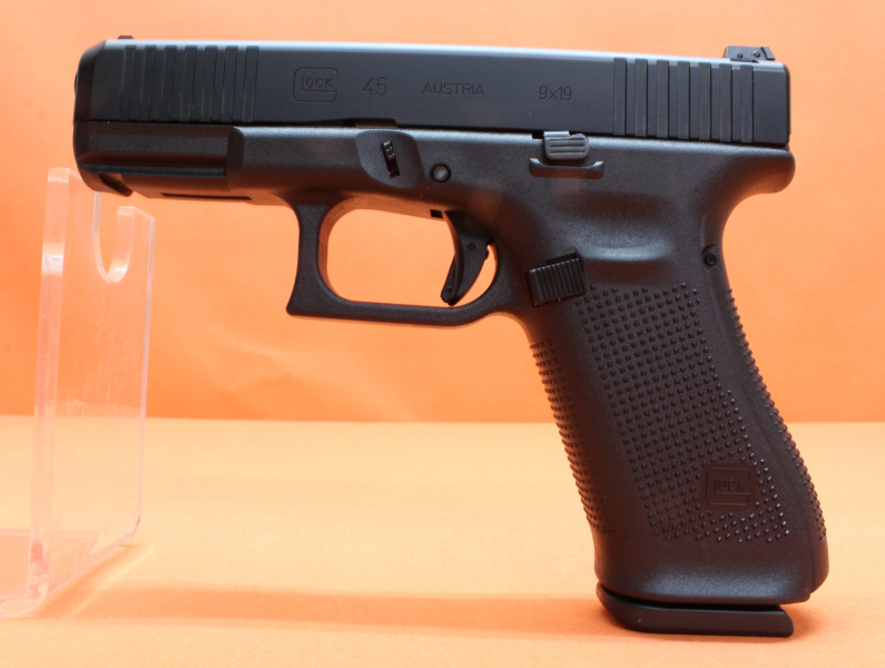 Ha.Pistole 9mmLuger Glock 45: Gen5 102mm GMB (Glock Marksman Barrel) Lauf, Verschluß mit Front Serrations, verstellbare Polymer-Kontrastvisierung, Gen5 RTF Polymer-Griffstück mit Zubehörschiene (Weaver)/ angetrichterter Magazinschacht, Gen4 Magazinhalter (li/re umbaubar), beidseitiger Verschlussfanghebel, Safe Action Abzug ca. 20N (teilvorgespannt, 2,0kg Steuerfeder), 17-Schuss Magazin (47572). Incl. 2 St. auswechselbare Griffrücken/ Reservemagazin/ Ladehilfe/ Putzstock/ Putzbürste. Kunststoffkoffer als Transportverpackung.