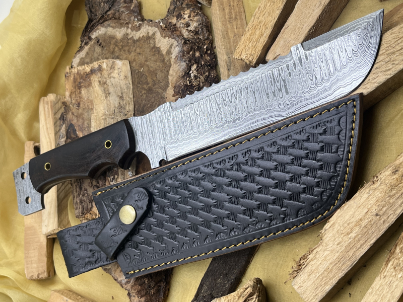 Typ: Handgefertigtes Bowie-Messer aus über 200 Lagen Damaststahl. Durchgehende Klinge (Full Tang) aus Damast. Walnussholzgriff. Inklusive hochwertiger Lederscheide.