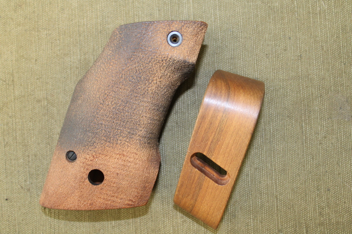 Verkaufe gebrauchte Formgriffschalen für Walther LP3. Aus Nußbaum. Befestigung für Handballenauflage und Schrauben für Griffstück fehlen.
