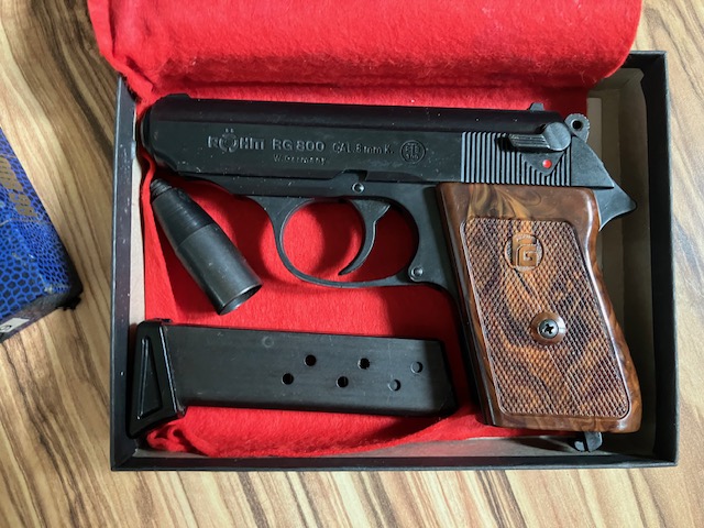 Lieferumfang: Pistole Röhm RG 800 8mm K mit Magazin, Abschussbecher und Originalschachtel (siehe Bilder)