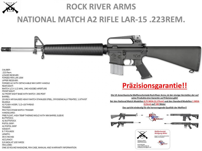 Biete ein AR15 im Kaliber .223Rem. Modell A2 National Match des US amerikanischen TOP Herstellers Rock River Arms! Sie werden mit dieser Waffe jeden anderen Selbstlader in Punkto Präzision und Verarbeitung schlagen! Kein Oberland, Schmeisser, Windham, Hera!!! Die Waffe verfügt über einen 20-INCH Stainless Match Lauf , 1:8 , Lauf freischwingend, RRA TWO STAGE MATCH Abzug und 10 Schuss Magazin! Die Waffe wird im Rock River Koffer geliefert! Bitte vor dem Kauf Kontakt zu mir aufnehmen! Ein kostenloses Einlagern bis zur EWB ist kein Problem! Rock River Arms gehört zu den besten Waffenherstellen Weltweit und ist in den USA die Nummer 1 Sie werden keine bessere Waffen bekommen! Auch andere Modelle in verschiedenen Kalibern des Herstellers lieferbar! Lieferzeit und Preis bitte anfragen!!!!!! WWW.Waffen-Miller.de Rock River Arms ist einer der Weltweit besten Waffenhersteller, sollten Sie mit der Waffe nicht zufrieden sein, nehme ich sie wieder zurück(qualitativ oder Schussleistung) !Rock River Arms ist der einzige Hersteller der eine Präzisionsgarantie von einem 3/4 MOA auf 100m gibt. www.waffen-miller.de Wir führen auch Waffenexporte ins Europäische Ausland durch, fragen Sie an !! Kaliber .223Rem. LOWER RECEIVER:Forged RRA LAR-15M UPPER RECEIVER:Forged A2 with Detachable NM Carry Handle REAR SIGHT:Match 1/2 x 1/2 min, .040 Hooded Aperture FRONT SIGHT:A2 Front Sight Base with Match .050 Post BARREL:20" Air Gauged Heavy Match Stainless Steel, Cryogenically Treated, 1:8 Twist MUZZLE:A2 Flash Hider / 1/2–28 Thread TRIGGER:RRA Two Stage Ultra Match Trigger HANDGUARD:Free Float, High Temp Thermo Mold with NM Barrel Sleeve BUTTSTOCK:A2 Buttstock PISTOL GRIP:A2 Pistol Grip WEIGHT:9.7 pounds LENGTH:39.5 Inches ACCURACY:3/4 MOA at 100 Yards INCLUDES:One 10 Round Magazine, RRA Case, Manual and Warranty Information