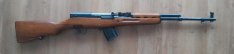 Zu Verkaufen: Selbstladebüchse SKS Simonov aus chinesicher Produktion (Norinco). Für die Büchse passen AK-47 Einsteckmagazine (evtl. Nacharbeit erforderlich). Zur Büchse gehören ein 10er-Magazin, ein Schalldämpfer (Ase Ultra, Edelstahl, cal. 9,3, M24x1,5), ein Laufadapter für SKS und 80 Schuss Barnaul Munition (nicht korrosiv, FMJ mit Stahlhülse).