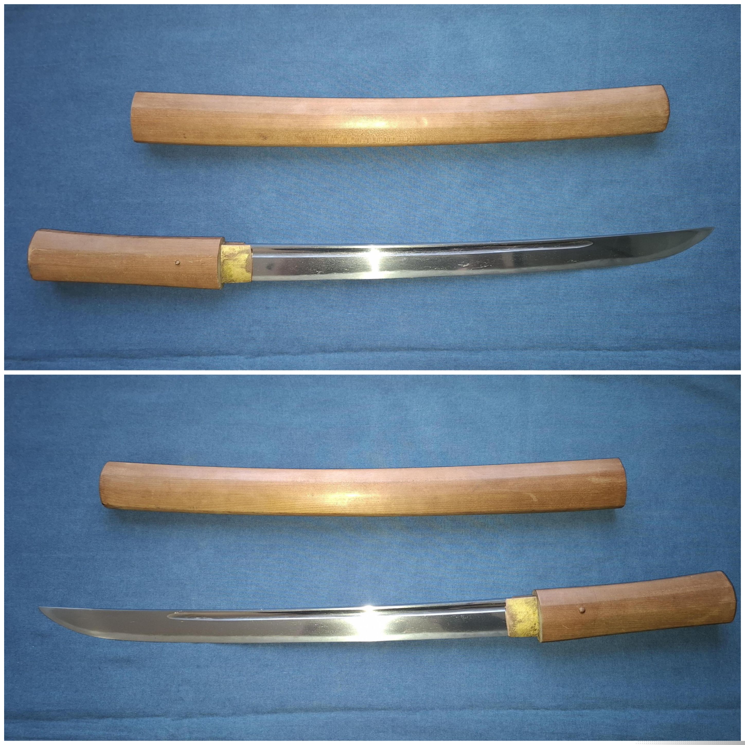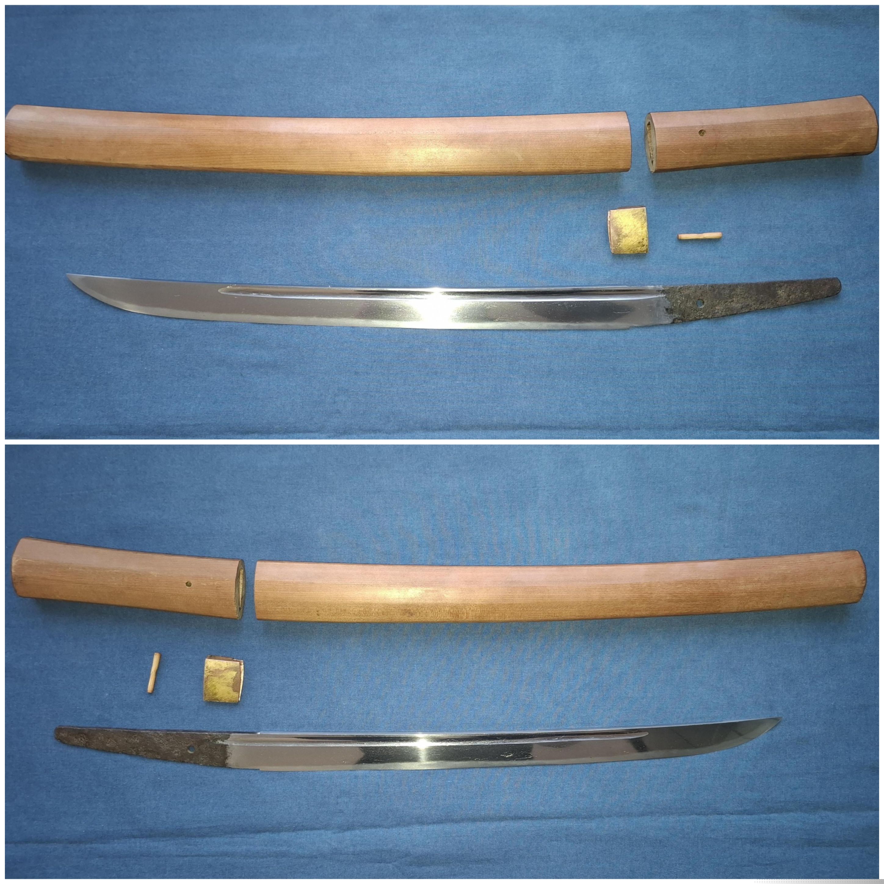 Schönes, originales Shirasaya zur Klinge. Altes, originales Habaki aus Kupfer mit Resten von Vergoldung.