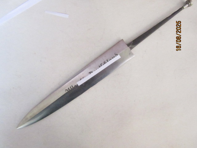 Klinge für SX-Dolch in einem neuwertigen Zustand. Wohl alter Lagerbestand. Kein Rost, keine Flecken. Deutlich sichtbar sind die originalen Schliffspuren des Herstellers. Die Kopfschraube ist auch Bestandteil dieser Auktion.