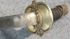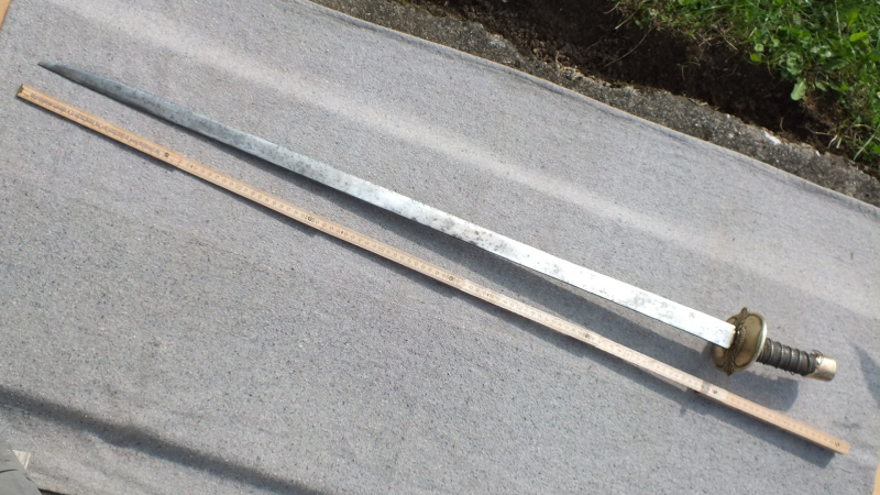 Schwerer französischer Pallasch um 1810 zu verkaufen. Da hier leider der Faustschutzbügel und die Scheide dazu fehlt, wird dieser Artikel als defekt und unvollständig angeboten !! Die keilförmige Klinge ist stolze 980 mm lang und ca. 34 mm breit. Die Klingenspitze verläuft in der Rückenlinie. An den Ricasso ist eine feine Punze mit einem " Jakobiner" gezeichnet. Altersbedingt ist die Klinge mit gereinigten Korrosionsnarben versehen. Die Klinge ist am Gefäß fest original vernietet! Der Griff hat starke Gebrauchsspuren und die Griffwicklung ist defekt und lose. Leider fehlt an dem alten Stück der Faustschutzbügel und ist dadurch zwangsläufig sehr lose! Trotz allen Ungereimheiten bleibt es ein Stück Zeitgeschichte aus der napoleonischer Kaiserzeit. Privatverkauf ohne Gewährleistungen und keine Rücknahme.