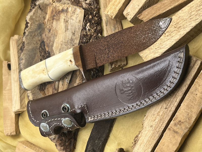 - Typ: Handgefertigtes Jagdmesser aus über 200 Lagen Damaststahl. Knochengriff. Damast-Parierstange und -Knauf. Inklusive Lederscheide.