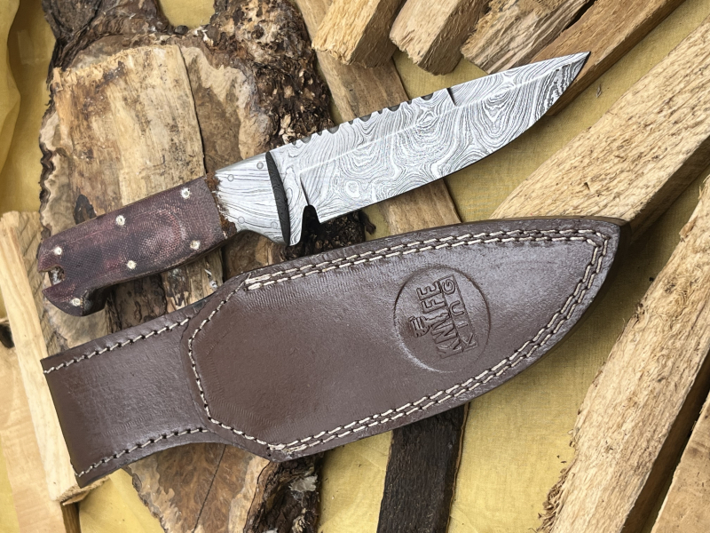 - Typ: Handgefertigtes Jagdmesser aus über 200 Lagen Damaststahl. Micarta-Griff, Vollerl-Damastklinge. Inklusive Lederscheide.