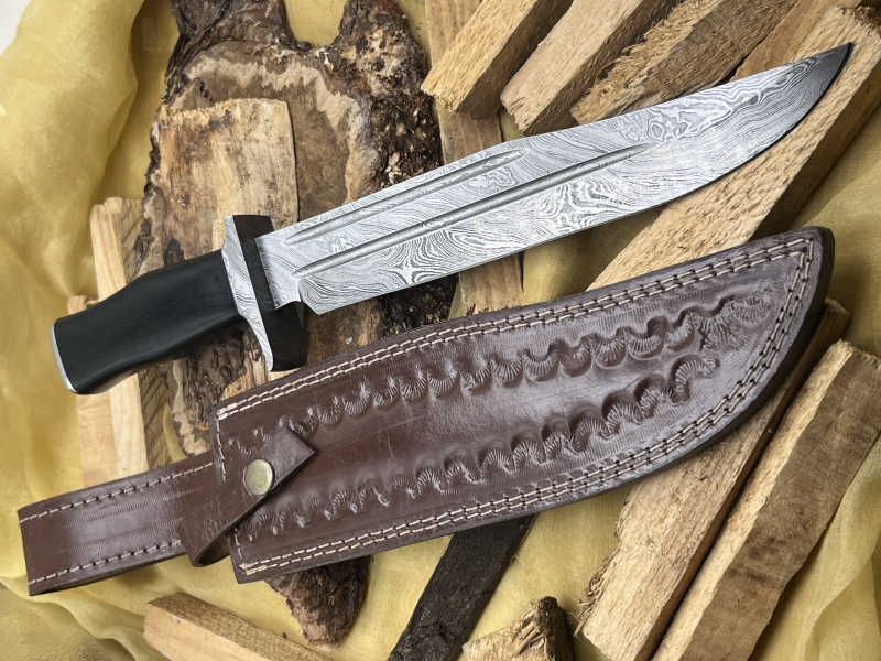 Typ: Handgefertigtes Jagdmesser aus über 200 Lagen Damaststahl. Griff aus schwarzem afrikanischem Ebenholz mit Damast-Parierstange und Damast-Knauf. Inklusive Lederscheide.