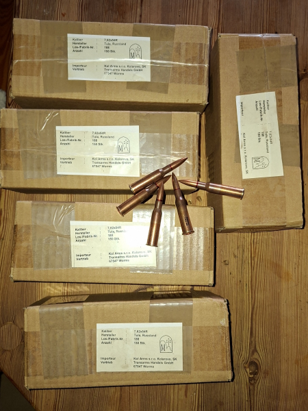 Zum Verkauf kommt jeweils ein ungeöffneter, original verpackter Karton mit 150 Schuß Kaliber 7,62x54R aus Tula Fertigung zum Preis von 120 EUR je Karton. Das entspricht 0,80 EUR pro Patrone.