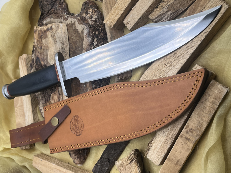 - Typ: Handgefertigtes Bowie-Messer aus D2-Stahl. Micarta-Griff mit D2-Parierstange und Knauf. Inklusive Lederscheide.