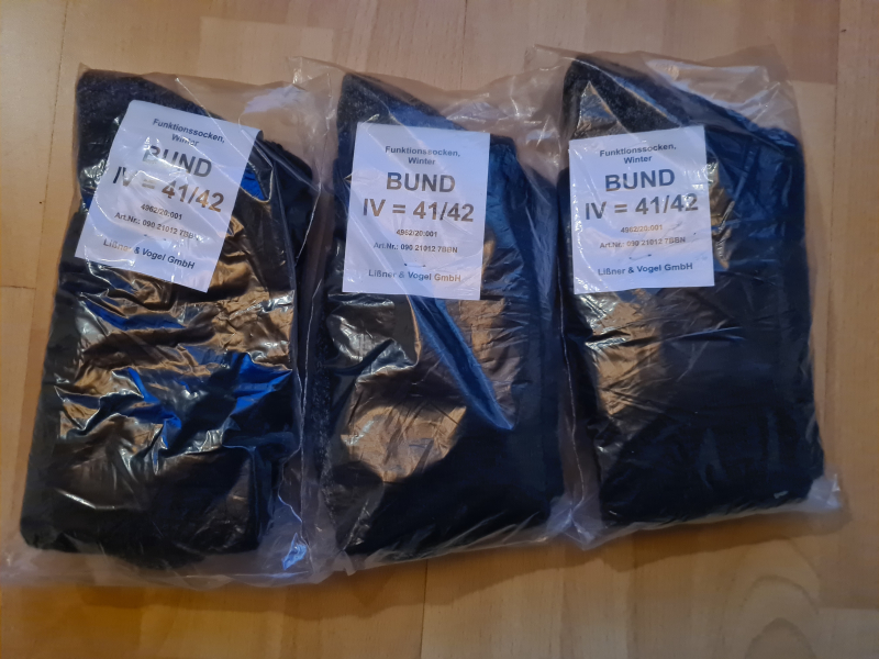 Zum Verkauf stehen drei Pack Funktionssocken der Bundeswehr. Diese sind neu und ungeöffnet. Ein Pack ist nicht auf dem Foto zu sehen, dieser ist geöffnet aber noch mit dem Faden verbunden. Dies ist ein Privatverkauf der ohne Gewährleistung und ohne Rücknahme erfolgt.