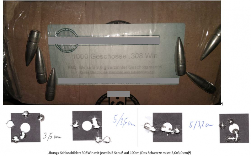 Verkaufe 1000 Geschosse DM 111, verzinnte VMBT mit geschlossener Spitze und geschlossenem Heck. Verkauf erfolgt wegen Überbestand. Diese zur Reibungsreduktion verzinnten Vollmantelgeschosse stammen aus delaborierten Patronen. Die Geschosse sind daher delaboriert. Geringfügige Ziehspuren sind vorhanden, verbliebene geringfügige Klebemassenresten sind leicht mit Diesel lösbar. Geschoßgewicht 9,5 g / 147gr. Präzision auf 100m gemäß hervorragendem Preis/Leistungs-Verhältnis gut.