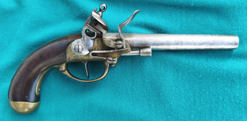 Runder gestempelter Lauf. Kal. circa 17,9mm glatt. Messingschloßkasten signiert und gestempelt. Nussholzgriff. Messingbeschläge. Alter Ladestock, gestempelt. Länge circa 34,5cm.