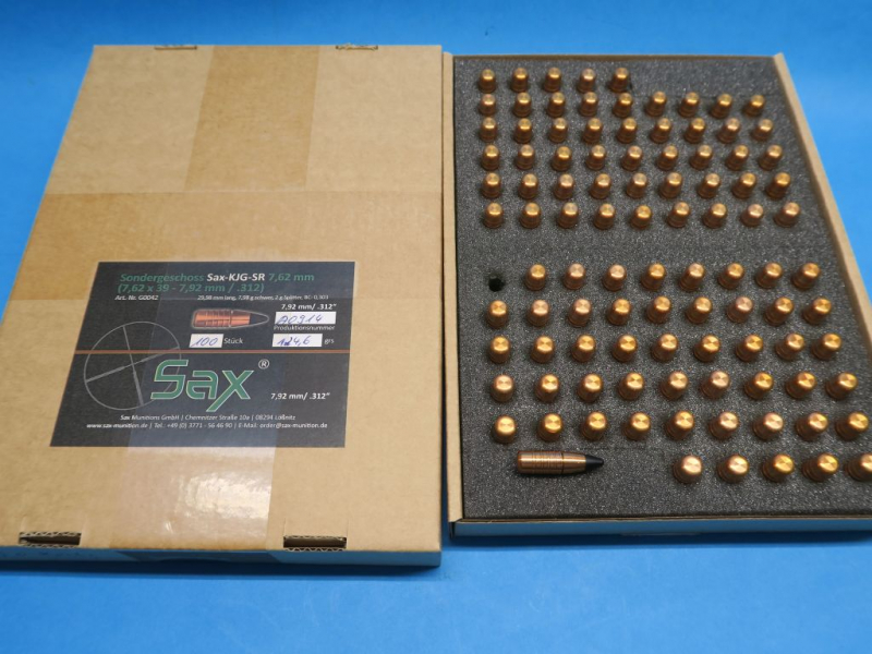 100 SAX-Kupferjagdgeschosse SAX KJG-SR, Nr. G0042, Kaliber: 7,62x39 - .312“, 8,0g (7,98g) schwer, 28,98 mm lang, 2,0 g Splitter, BC: 0,303