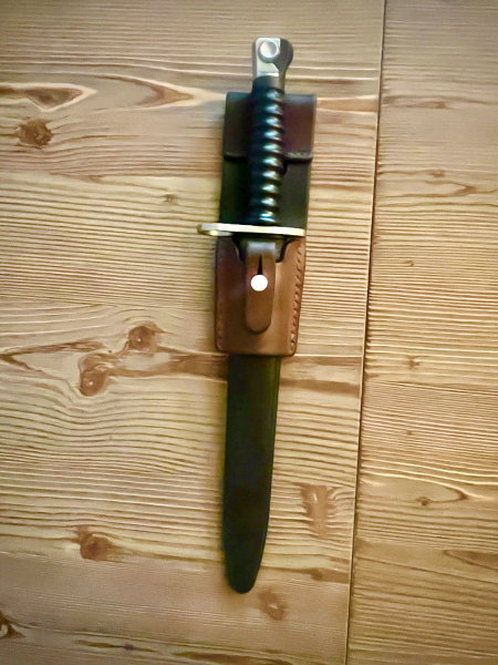 Verkaufe ein Schweizer Bajonett Mod. 1957 mit Original Frosch. Hersteller ist die Firma WENGER. Länge ( Gesamt ) 365 mm, Klingenlänge 240 mm.Zustand sehr gut, man kann sagen neuwertig. Schreiben sie bitte wenn sie Fragen haben.