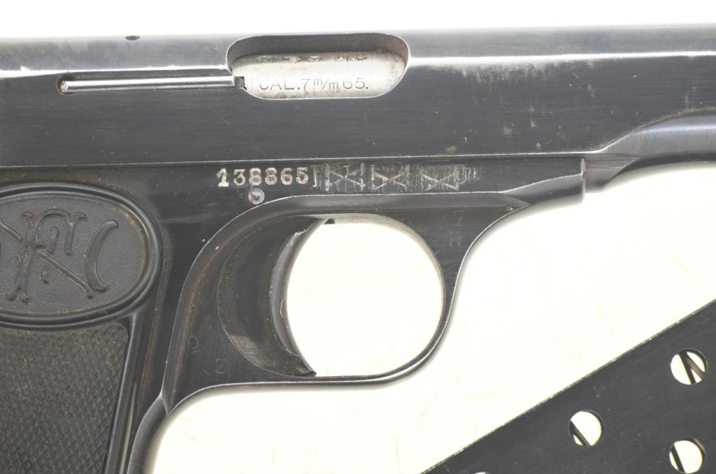 Herstellerschriftzug "FABRIQUE NATIONALE D`ARMES DE GUERRE HERSTAL - BELGIQUE", Patenthinweis „BROWNINGS`S PATENT DEPOSÉ“, Seriennummer "138865", gültige belgische Beschusszeichen auf Rahmen, Schlitten und Lauf, kleines Importeurzeichen "Geco" (= Genschow & Co.) links auf dem Abzugbügel. Prüfstempel "H" unter Sternchen an mehreren Stellen, Prüfzeichen des Kontrolleurs Woit Christophe, im Werk tätig ab 1938 bis 1968. Auf dem Griffstück rechts befand sich rechts neben der Seriennummer eine Prägung, vermutlich ein behördlicher Eigentumnsstempel, der aber komplett ausgestempelt wurde - nicht mehr zu erahnen, was hier einmal zu lesen stand. Eventuell handelt es sich um deutsche Polizeistempelungen, dem Seriennummernbereich nach.